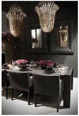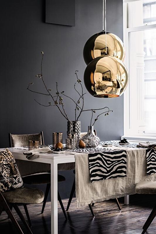На фоне черных или темно-серых стен особенно эффектно смотрятся предметы интерьера с эффектом металлик, серебристые или медные детали, а также хрусталь и граненные элементы декора из стекла. Блеск всегда требует глубокого темного фона.