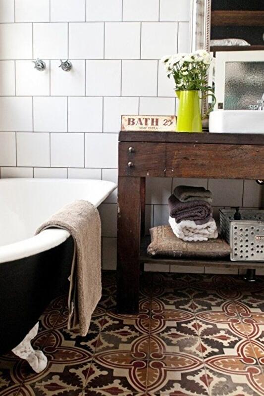 Акцент на пол, керамическая плитка с выразительным, сложным, витиеватым рисунком в сочетании с минималистичными стенами. Стены должны быть максимально нейтральными, чтобы пол смотрелся выразительнее.