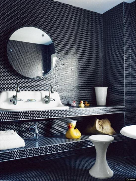 По-прежнему актуальна и очень популярна плитка-мозаика для отделки стен и пола ванной комнаты. Особенно элегантно смотрится глянцевая плитка темных тонов.