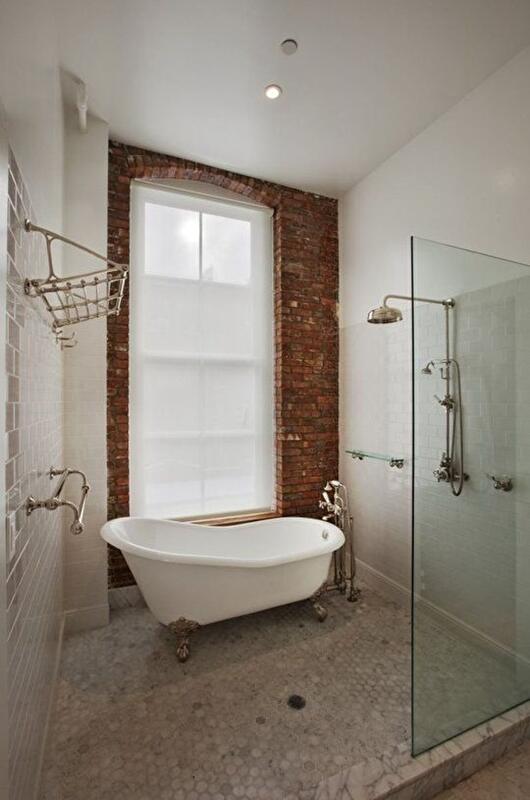 Более привычно видеть такой элемент в интерьерах в стиле лофт, однако ванная в частном доме с акцентированной кирпичной стеной также выглядит интересно и стильно.