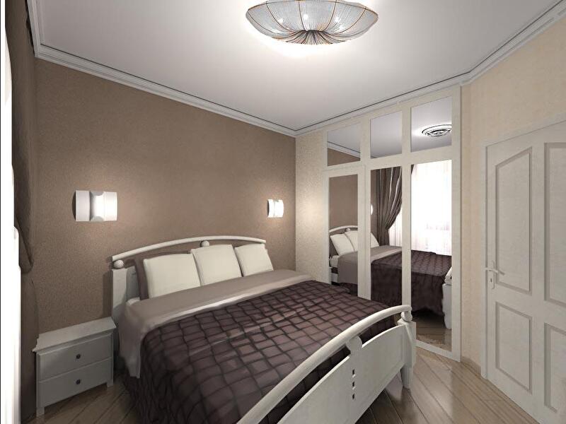Кровать в спальне – самый главный предмет мебели. Конечно, можно ограничиться диваном, но для здоровья врачи рекомендуют спать все таки, на кровати, да и не каждый диван выдержит ежедневное раскладывание и складывание много лет подряд. Для такого небольшого помещения не стоит приобретать кровать шириной два метра, попробуйте ограничиться шириной 1 метр 60 сантиметров или хотя бы метр восемьдесят. Что касается тумбочек – вполне достаточно и одной, а для второго члена семьи прикрепить лампу или бра на стену. Также существуют специальные полочки для закрепления над изголовьем кровати – с ними можно обойтись без тумбочек вообще.