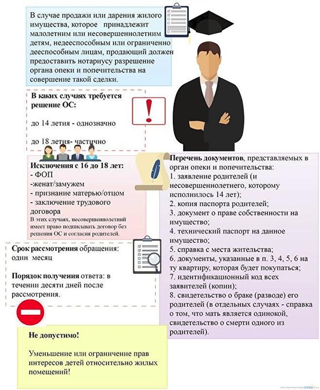 При продаже или дарении жилого недвижимого имущества, принадлежащего ребенку, продавцы или дарители обязаны предоставить нотариусу официальное разрешение органов опеки на проведение такой сделки.