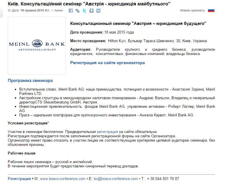 Український банк відкриває кореспондентський рахунок у Meinl Bank Aktiengesellschaft (Meinl Bank AG), юридична адреса: Бауернмаркет, 2, А-1010, Відень, Австрія, власником і головою опікунської ради якого є президент Юліус Майнл, відомий не лише виходом з-під арешту під заставу у 100 млн євро (можливо, і з кишень українців), звинуваченням у жовтні 2015 року у фальсифікації звітності та виключенням банку з торговельного реєстру Австрії, а й тим, що називає себе «найненависнішою людиною в Австрії».