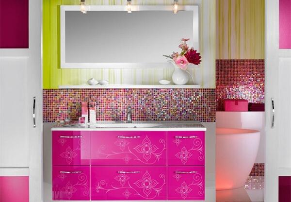 Это самый простой вариант придать цветовой насыщенности ванной комнате. При этом, вы можете играть и фантазировать сколько угодно. Можно выделить одну стену яркой плиткой, а остальные лишь поддержать пастельной гаммой. Или же выполнить отдельные элементы ярким цветом – выложить рамку около зеркала, сделать оригинальный керамический ковер, отделить зоны ванной и туалета (при совмещенном санузле). Можно сделать яркие акценты в виде оригинальных орнаментов с помощью декоративной мозаики, выглядит очень эффектно и креативно.