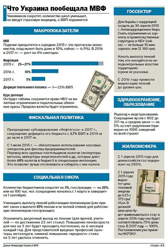 В распоряжении "Сегодня" появился текст Меморандума МВФ, где прописаны условия, при которых Украина может рассчитывать на четырехлетний кредит в размере $17,5 млрд. По информации наших источников в Кабмине, сканы документов, где есть подписи президента Петра Порошенко, премьер-министра Арсения Яценюка, министра финансов Наталии Яресько и главы НБУ Валерии Гонтаревой, соответствуют подлинным договоренностям. "Власти сейчас активно реализуют предварительные условия, в рамках которых мы можем получить деньги МВФ. Есть большие шансы, что Украина получит деньги в середине марта. Изначально обсуждался размер первого транша — $4,5 млрд, теперь переговоры ведутся вокруг $6—8 млрд. Думаю, все окончательно станет известно 8—11 марта", — отметил наш источник. "Сегодня" выяснила, на какие именно уступки пошла Украина ради кредита МВФ (см. инфографику) и как эти изменения повлияют на жизнь народа.