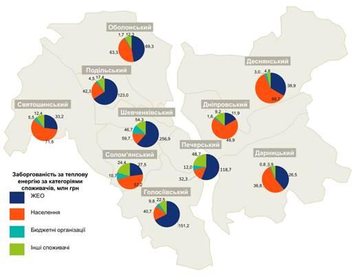 Наиболее критическая ситуация с расчетами за тепло, отопление и горячую воду сохраняется в Святошинском (101,8 млн грн), Деснянском (82 млн грн) и Подольском (69,6 млн грн) районах столицы.