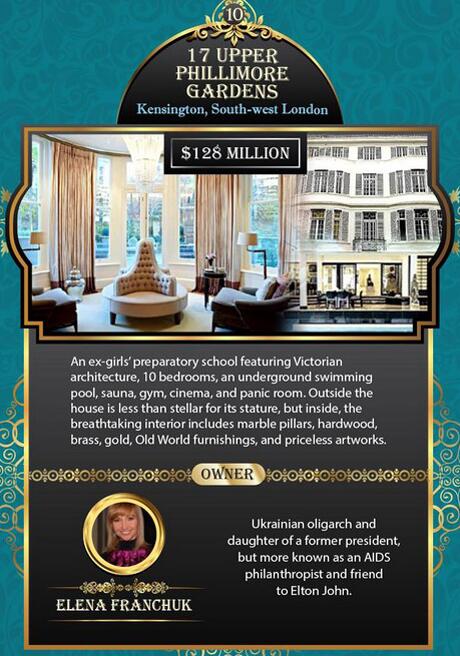 Дом на юго-западе Лондона, который принадлежит председателю фонда "АнтиСПИД и жене миллиардера Виктора Пинчука Франчук, занимает 10 строчку рейтинга. Его оценивают в 128 миллионов долларов.