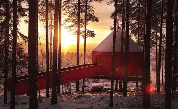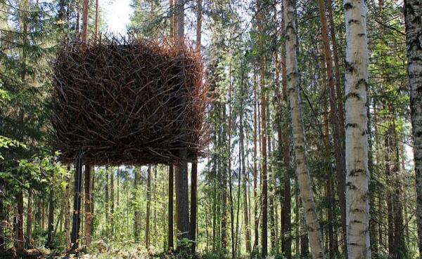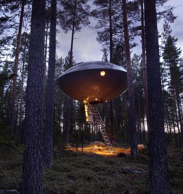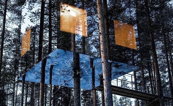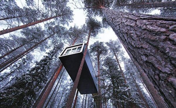 Номера Treehotel, расположенного на севере Швеции, находятся прямо на деревьях — они представляют собой легкие алюминиевые конструкции, установленные вокруг дерева. Всего 5 уникальных номеров различной формы: Cabin, Mirrorcube, Bird’s Nest, Blue Cone, UFO. В каждом номере отопление, электричество, набор для приготовления кофе/чая, ванная комната, терраса. Из окон открываются виды на реку Lule и простирающиеся на многие километры леса.