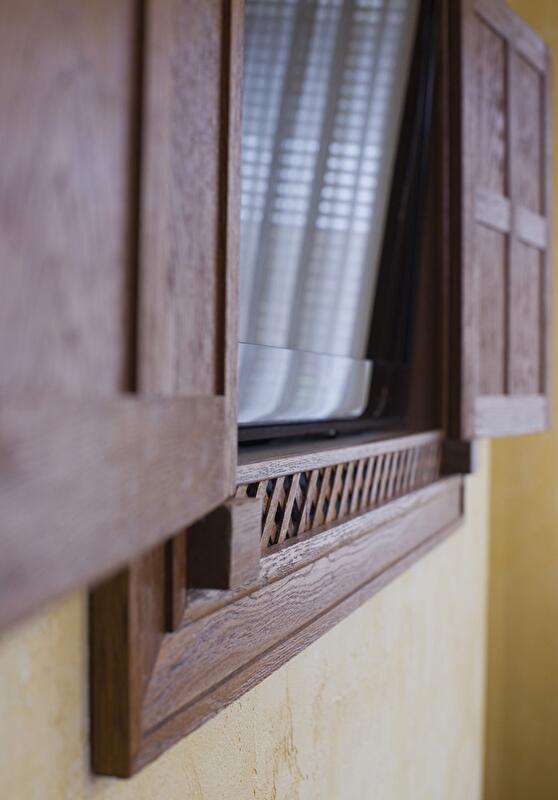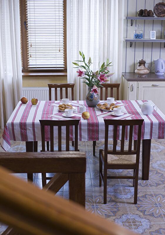 Текстиль для вікон на кухні та вітальні підібраний з льону, що є також продовженням традиції оформлення української хати. Так вікна зсередини завішувалися оздобленими занавісками, через які можна було бачити все, що діється на вулиці, але погано видно, що в хаті. Подекуди вікна прикрашалися рушниками, що служили оберегами.