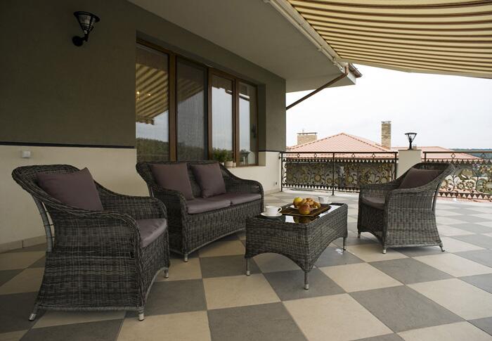 Висувна маркіза на відкритій терасі підібрана в традиційні кольоровій гамі — комбінації різної товщини сірого та червоного кольору на білому тлі.
