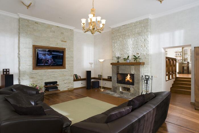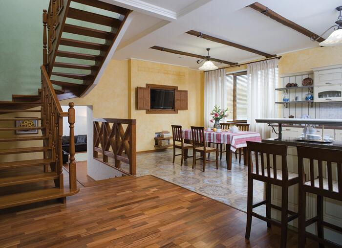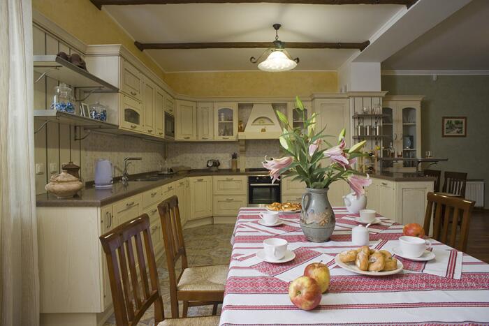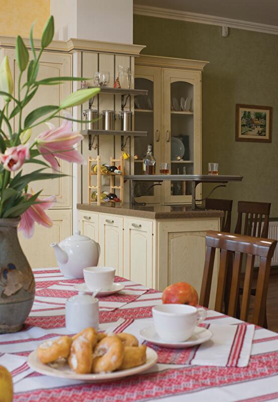 Стіни на кухні прикрашають картини вишиті господинею будинку, а в вітальні картини українського художника Івана Марчука. Кольорова гама інтер’єру, форма столярних виробів, освітлення підібрані відповідно до українського фольклорного стилю».