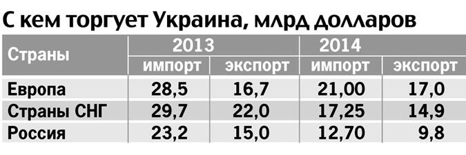 Итог не заставил себя долго ждать. Первые четыре месяца 2015 года показали падение взаимной торговли России и Украины в среднем на 64%. То есть сейчас товарооборот в три раза меньше, чем еще год назад. При этом Украина купила у России товаров на 2,9 млрд долларов, тогда как годом ранее эта сумма была 8,1 млрд долларов. Экспорт украинских товаров упал с 4 до 1,6 млрд долларов.