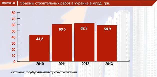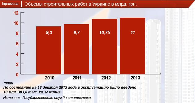 По данным Государственного комитета статистики Украины, в 2013 году в стране выполнено строительных работ по возведению жилья на сумму 10,2 млрд гривен . Также в 2013 году, по сравнению с 2012 годом, объем строительства жилых зданий вырос на 6,6%. В целом же новое строительство, реконструкция и техническое перевооружение составили 81,4% от общего объема, капитальный и текущий ремонты — 11,2% и 7,4% соответственно. При этом в прошлом году на строительство зданий потрачено 27,8 млрд гривен , а на строительство инженерных сооружений — 31 млрд гривен .