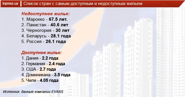 Хотя Украина участия в рейтинге не принимала, ее показатель высчитать довольно легко. В 2013 году средняя зарплата в Киеве составляла, по разным данным, - 5000-5100 гривен. Средняя цена квадратного метра жилья (опять же по разной сопоставляемой базе) - около 1100-1200 долларов. При подсчетах получаем цифру 11.5 - это и будет киевский коэффициент недоступности жилья. Если сравнивать с самыми низкими показателями рейтинга, то украинцам нужно работать в 5 раз дольше, чем датчанам, которым для покупки жилья нужно поработать чуть более двух лет. То есть среднестатистическому киевлянину придется отработать на двухкомнатную квартиру площадью 70 квадратных метров где-то 11,5 лет . Правда, если он при этом не будет тратить деньги на что-либо иное вообще. Впрочем, применив указанный выше метод, каждый сам может высчитать, сколько ему потребуется времени для приобретения собственной квартиры.