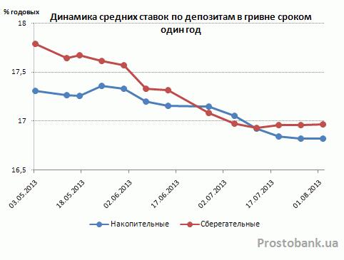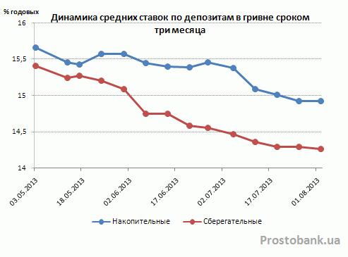 По исследованию компании «Простобанк Консалтинг» на 02.08.2013 г., темпы снижения средних ставок по гривневым депозитам остаются неименными – 0,12-0,54 п.п. за месяц. Правда, если в июне-2013 лидерство было за сберегательными вкладами, то в июле-2013 – за накопительными. Среднерыночные ставки по депозитам с правом пополнения за прошедший месяц просели на 0,33-0,54 п.п. – до 14,9%-16,8% годовых. Что же касается средних ставок по вкладам без права пополнения, то они уменьшились на 0,12-0,28 п.п. – до 14,3%-17% годовых.