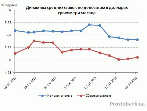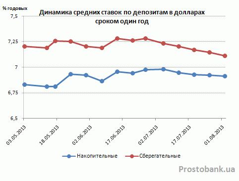 Долларовые депозиты после двух месяцев незначительно роста решили последовать примеру гривневых вкладов. По исследованию компании «Простобанк Консалтинг» на 02.08.2013 г., за июль-2013 депозиты в американской валюте потеряли 0,1-0,3 п.п. своей привлекательности.