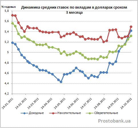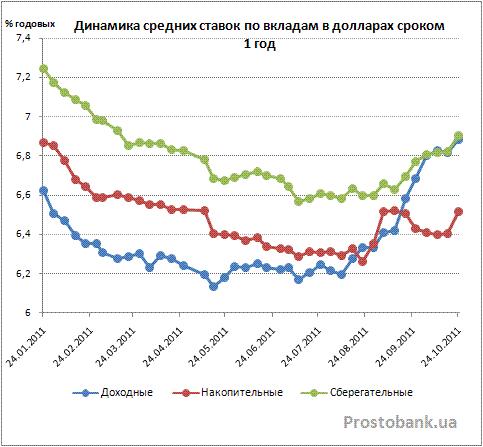 А непосредственной темой сегодняшнего обзора стали депозиты в долларах от украинских банков. По сравнению с вкладами в евро, средние ставки по долларовым депозитам по исследованиям компании «Простобанк Консалтинг» на октябрь-2011 на 1,5-2 процентных пункта или примерно на треть выше. Максимальные ставки по вкладам в долларах также выше: 11% годовых против 9,5% годовых по депозитам в евро.