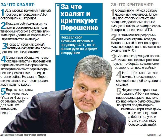 «ГЛАВНЫЙ». Порошенко, несмотря на парламентско-президентскую республику, умудрился показать, кто в стране главный, считают эксперты. «Мы увидели, кто самый активный игрок в стране. Смотрите, как президент подошел к перевыборам Рады — через роспуск коалиции и кризис правительства. Он убедил Яценюка остаться на посту премьера, и теперь они вместе влияют на парламент без коалиции, — пояснил нам Фесенко. Также эксперт считает, что в Украине еще не было президента, столь активного во внешней политике: «Порошенко хорошо знает эту сферу (в 2009—2010 гг. он работал министром иностранных дел. — Авт.), и она ему нравится». А то, что президента сложно упрекнуть в невыполненных обещаниях, объясняется просто: «Как человек умный, он давал не так много конкретных обещаний — разве что под влиянием эмоций (в ходе предвыборной кампании Порошенко заявлял, что «АТО должна и будет длиться не месяцы, а часы. Но террористов до сих пор не одолели. — Авт.). Но общую обещанную стратегию он реализует».