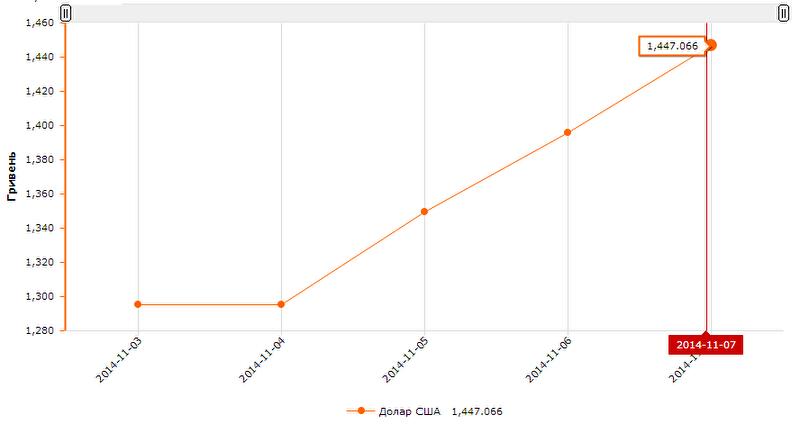 7 ноября, официальный курс доллара в Украине побил новый исторический рекорд – 14,47 грн/долл. Еще никогда официальная стоимость американской валюты не поднималась выше 14 грн. Предыдущий рекорд шокировал украинцев только вчера, в четверг – это был курс 13,995 грн/долл.