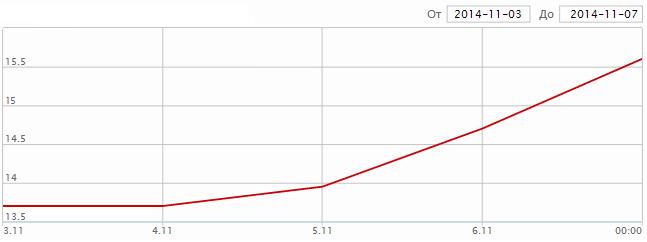 Утро четверга, 6 ноября, на межбанке началось с падения доллара на 1 копейку. Но укрепиться гривне не удалось – уже к полудню курс перевалил за 14 грн/долл . Обменники в этот день резко взвинтили курсы – средний курс покупки доллара в украинских банках вырос на 41,67 коп до 13,36 грн; продажи – на 71,44 коп до 13,92 грн. После анализа средневзвешенного межбанковского курса НБУ к двум часам дня установил на тот момент рекордный официальный курс 13,955 грн/долл. Именно этот рекорд и был побил через сутки.