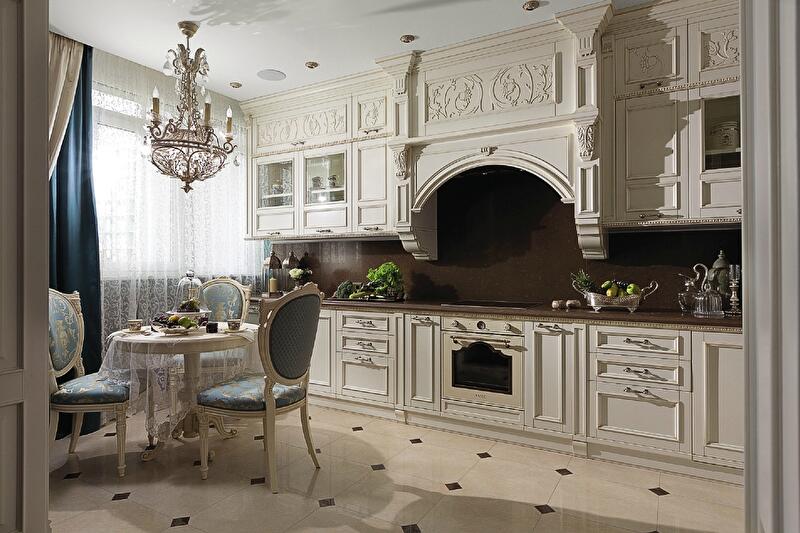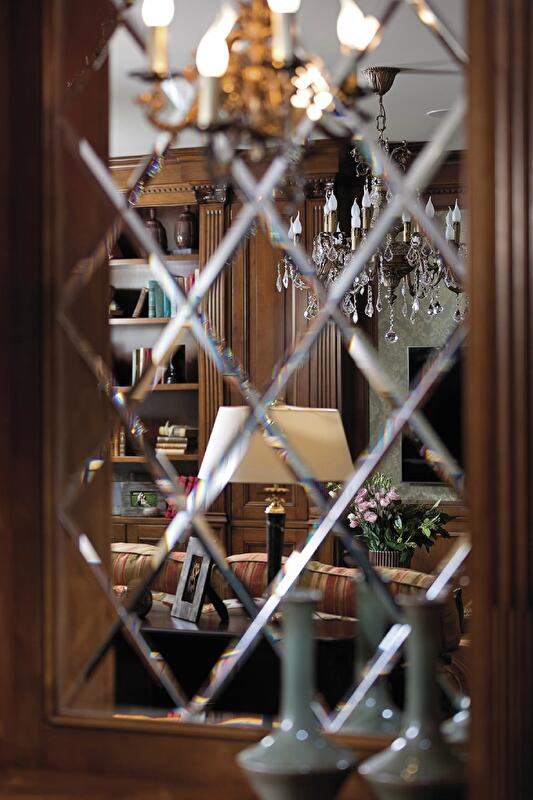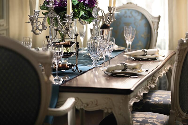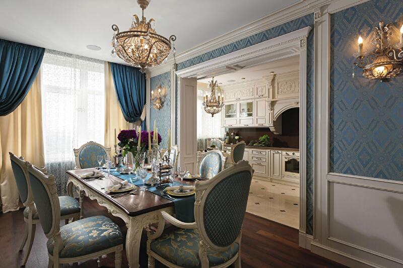 В объединенных широким порталом столовой и гостиной преобладают белый и голубой с нежными песочными акцентами и золотистыми бликами. Затейливые кованые светильники, резьба на стульях и кухонных фасадах и выписанный золотом орнамент на обоях «успокаивают» лаконичные драпировки и скромный наборной паркет. Тем не менее вечером интерьер неизменно приобретает торжественный лоск: свет преломляется в подвесках люстр, полированном мраморе на полу, а также множестве золотых и глянцевых деталей на фурнитуре и аксессуарах. Подыгрывают им шкафы для посуды – с зеркальными фасадами и подсветкой.