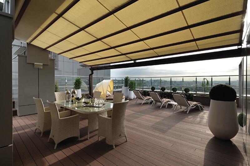 Кухня является полноценной альтернативой находящейся на нижнем уровне. Столовая зона скрыта в тени автоматических ролетов, которые также защищают от дождя. От ветра и шума терраса ограждена двойным закаленным стеклом.