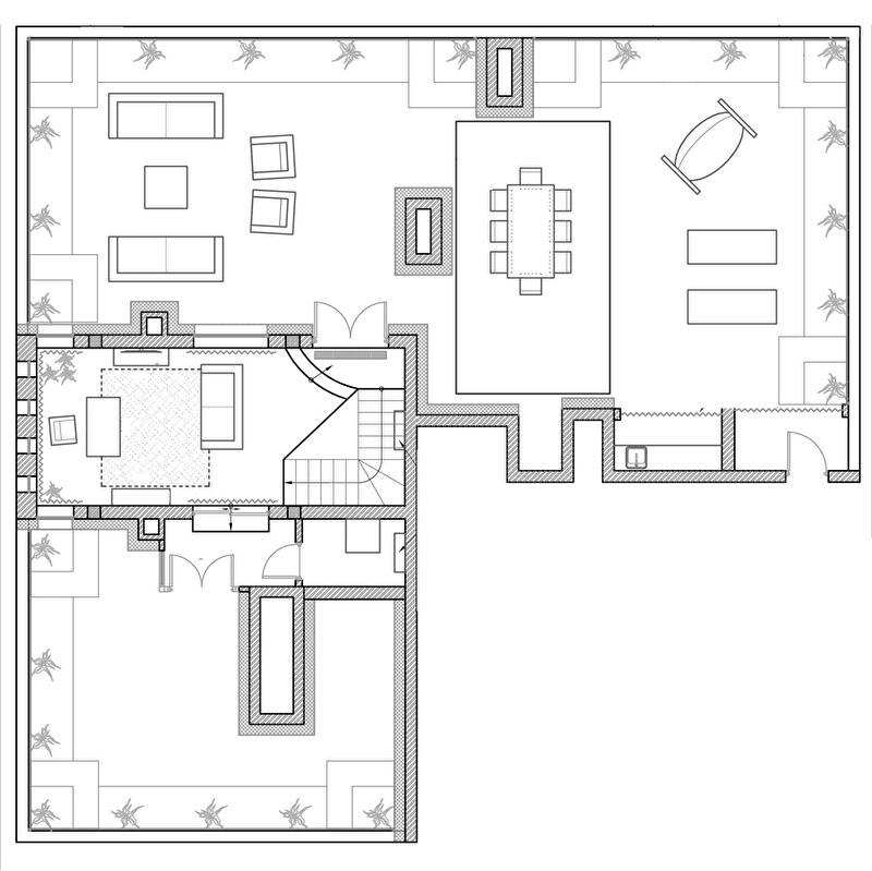 В оформлении верхнего уровня использована мебель из ротанга – комфортная и практичная за счет съемных элементов. Цветовая гамма – теплая, успокаивающая. Натуральные отделочные материалы – дерево и лен – создают атмосферу отдыха на природе. Усиливают впечатление высаженные здесь зеленые растения: чтобы обеспечить их жизнедеятельность, архитекторам пришлось позаботиться о системе автоматического полива.