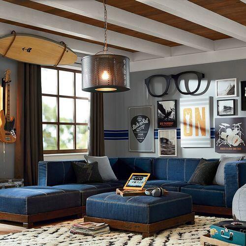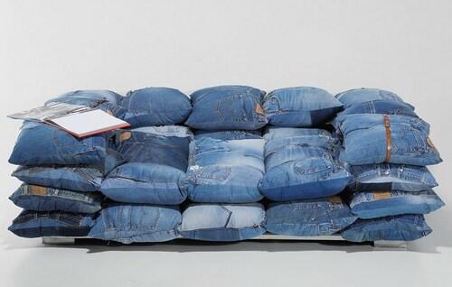Использование джинсовой ткани (денима) характерно, скорее, для молодежного стиля. Прочная, немаркая и немного небрежная «джинса» будет органично смотреться в комнате подростка, квартире-студии творческого человека или в гостиной для молодой семьи. Диванные чехлы, обивка стульев и кресел, декоративные подушки и другие аксессуары придадут изюминку такому интерьеру, причем это могут быть как вещи фабричного производства, так и самодельные изделия.
