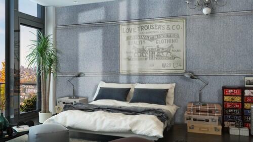 Обои, имитирующие джинсовую ткань, в интерьере спальни, Glamora