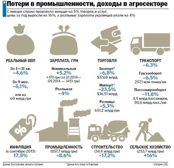 Ситуация на Донбассе отрицательно сказывается на экономике Украины. При этом ущерб от боевых действий двойной: бюджет тратит миллионы гривен на обеспечение наших военных на Востоке, а учитывая, что бои идут на нашей территории, разрушается инфраструктура и гибнет промпотенциал самого индустриального региона страны. По словам премьера Арсения Яценюка, один день боев стоит Украине 80 млн грн (2,4 млрд грн в месяц)! "Сегодня" разбиралась, как изменилась жизнь украинцев за год (см. инфографику).