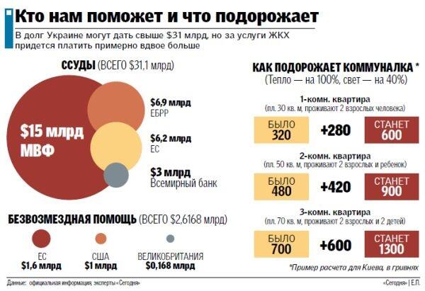 Завтра заканчивает работу в Украине миссия МВФ, которая должна была разработать программу экономических реформ в нашей стране. По словам директора-распорядителя МВФ Кристин Лагард, реформы приведут к устойчивому росту экономики и защитят уязвимые слои населения. Вчера министр финансов Александр Шлапак подтвердил, что программа разработана, но подробности не сообщил, пообещав сделать это 21 марта. По данным нашего источника в Минфине, в частности договорились, что первые $1 млрд Украина получит до 10 апреля в обмен на двукратное повышение с 1 апреля цен на тепло, воду и на 40% на электроэнергию. Остальные деньги пойдут уже после президентских выборов, в июне. Всего Украина рассчитывает на $15 млрд в течение двух лет. Также запуск программы МВФ одновременно позволит начать финансирование по программам ЕС, ЕБРР и Всемирного банка (см. инфографику) на сумму $16,1 млрд грн в течение двух лет и предоставление уже в ближайшие месяцы безвозмездной помощи более чем на $2,6 млрд грн. Но с учетом того, что эти деньги пойдут не на проедание (за исключением $2 млрд от ЕС, предназначенных для оплаты российского газа), а на экономические реформы — введение европейских стандартов качества продукции и правил ведения бизнеса, в частности бухучет и оплату налогов, модернизацию сферы ЖКХ, строительство дорог, украинцам придется серьезно затянуть пояса, чтобы уменьшить расходы бюджета. Так как, по официальным данным Минфина, уровень доходов казны пока ниже плановых на треть из-за падения экономики. То есть за два месяца недополучено около 20 млрд грн. При этом появились 6,9 млрд грн внеплановых расходов на оборону.