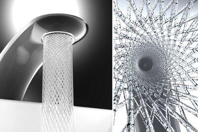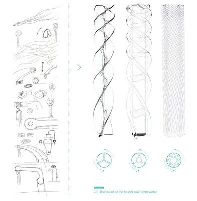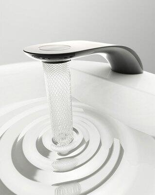 Секрет работы конструкции в том, что поток воды, проходя между двойной турбиной, расщепляется на струи, которые затем закручиваются в изящные спирали, создавая на выходе сложную и красивую водяную решётку. При этом турбина ограничивает поток воды на 15%, так что использование такого крана будет означать экономию ресурсов и средств. Три разные вида насадок позволят пользователям выбрать, какой именно режим экономии воды им предпочтительней.