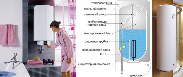Электрические водонагреватели делятся на два вида: накопительные и проточные. Каждый из них имеет свои плюсы и минусы, а также требования к установке. К примеру,накопительные водонагреватели или как их еще называют – бойлеры, требуют достаточно места для размещения внушительных размеров бака (от 15 литров до 200 и более) с запасом горячей воды. В этом их основной минус, который часто становится настоящей проблемой в малометражных квартирах. Зато они имеют небольшую мощность и потребляют совсем немного энергии (1-6 кВт) для поддержания температуры воды в баке, поскольку небольшие теплопотери при длительном хранении в любом случае неизбежны. Принцип действия этого прибора похож на термос с подогревом. В тот момент, когда вы открываете кран и выпускаете определенное количество воды, в него поступает такая же порция холодной и начинает греться до заданной температуры. Смешивания воды разных температур не допускают специальные рассекатели.