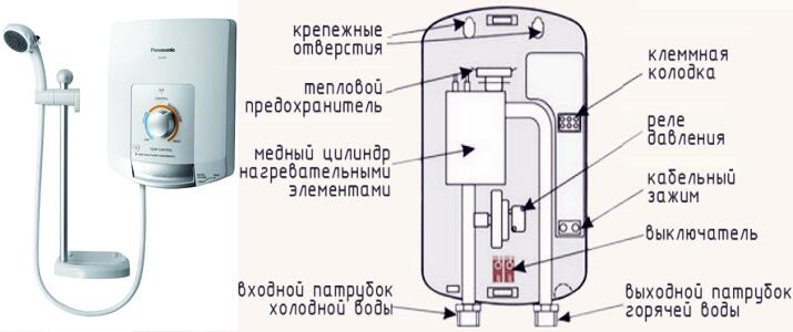 Что же касается проточных водонагревателей, то они работают, что называется «в реальном времени». Эти агрегаты устроены идеально просто: вода в них протекает через трубку с нагревательным элементом, который включается с помощью реле вместе с включением крана. Сразу оговоримся, что вода не контактирует непосредственно с нагревательным элементом, поскольку он припаян по внешней стороне спиральной медной трубки-теплообменника, а потому вопрос накипи и коррозии металла здесь практически не рассматривается вообще. А вот температура воды зависит от мощности водонагревателя и от того, насколько сильно открыт кран. Мощность прибора, кстати – это его «слабое звено»: она может в 10-15 раз превышать мощность накопительных водонагревателей, достигая показателя 30-50 кВт. Для комфортного принятия душа нужна мощность не меньше 12-16 кВт. Вот тут и кроется проблема для старых домов со слабой проводкой, которая, как правило, рассчитана на нагрузку до 2 кВт. Подключение проточного электронагревателя воды становится возможной только при установке нового счетчика и отдельного трехфазного кабеля, а также дополнительной защите с помощью УЗО и автоматического предохранителя на 25-40 ампер.