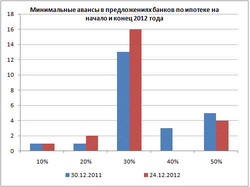 Минимальные авансы в 2012 году не претерпели значительных изменений. По-прежнему на рынке доминируют предложения с 30%-ным первоначальным взносом как при покупке нового жилья (10 из 15 предложений), так и «вторичного» (16 из 23 предложений). Есть и варианты с более низким авансом. «Правда, воспользоваться таким приложением можно предоставив дополнительный залог. Это может быть недвижимость, которая находится в собственности как заемщика, так и имущественного поручителя», – анализирует ситуацию Владимир Радько, начальник отдела альтернативных каналов продаж Банка Кипра.