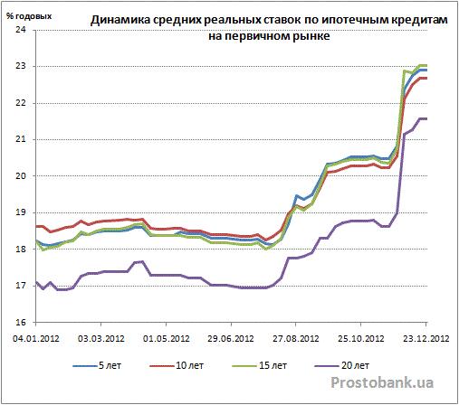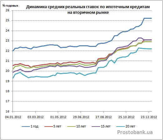 Средние реальные ставки по кредитам на покупку жилья на вторичном рынке недвижимости за 2012 год выросли на 2,5-3,2 процентных пункта в зависимости от срока. По исследованию компании «Простобанк Консалтинг», по займам сроком 10 лет рост составил с 20,2% до 22,9% реальных годовых. Самыми «дорогими» по-прежнему остаются краткосрочные займы сроком на 1 год, стоимостью 25,2% реальных годовых. Самыми «дешевыми» – 20-летние, со средней реальной ставкой в 22,1% годовых.