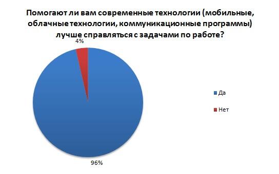 Согласно опросу, проведенному карьерным порталом rabota.ua, современные инновационные технологии (коммуникационные программы, облачные технологии) оказывают полезную службу подавляющему числу наших респондентов. Они полезны для 96% опрошенных.