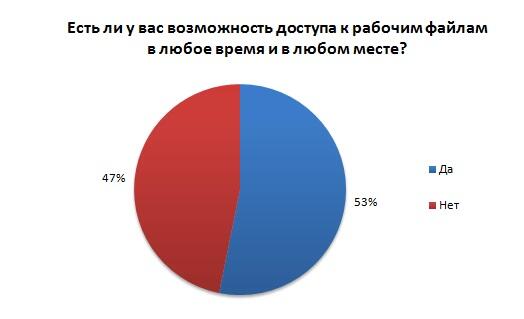 Возможностью доступа к рабочим файлам в любом месте и в любое время обладают 53% опрошенных. Оставшиеся 47% сталкиваются с некоторыми сложностями в данном случае. Проблемы есть как в организации самого процесса удаленного доступа, так и в обеспечении его безопасности.