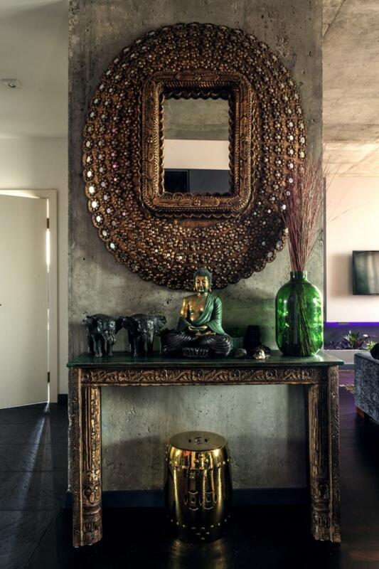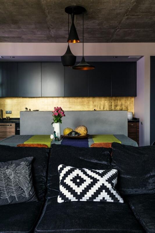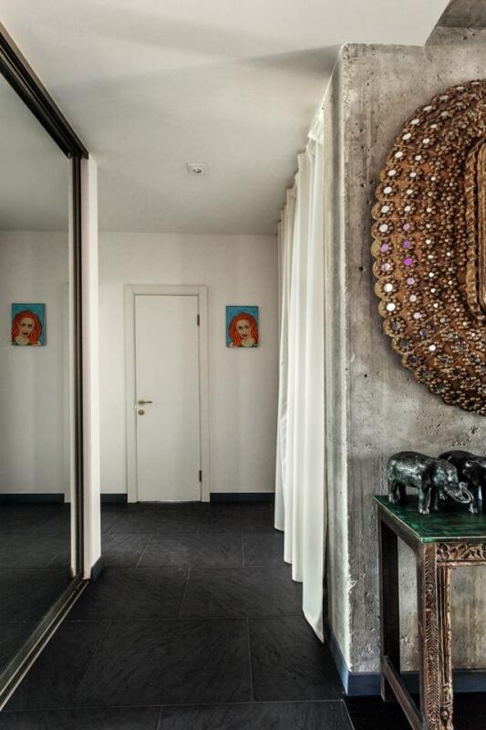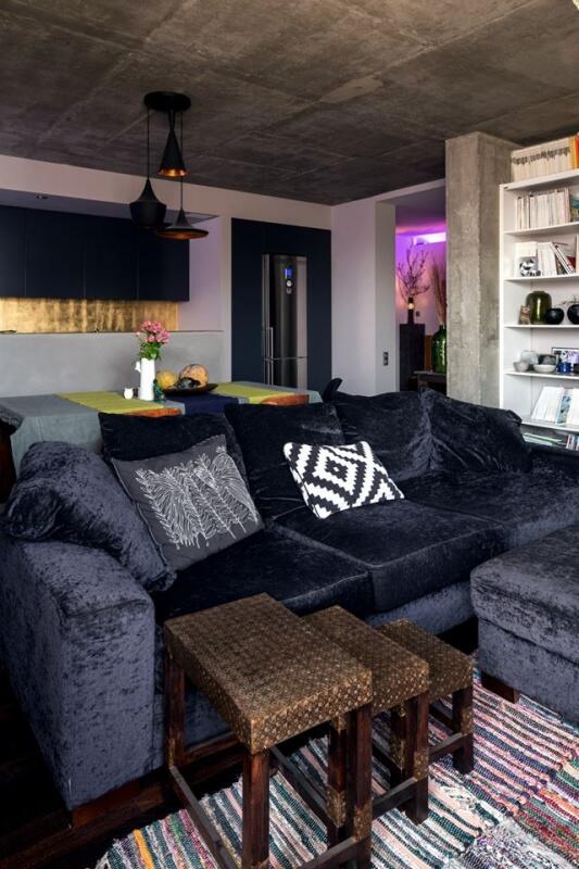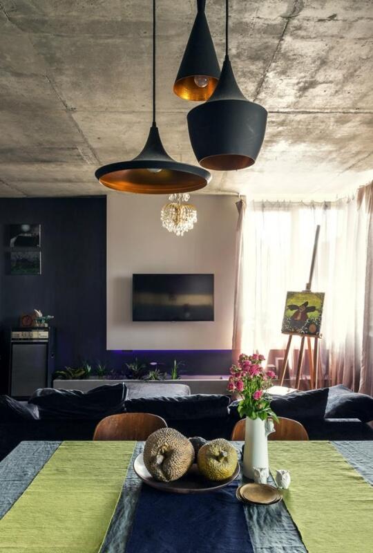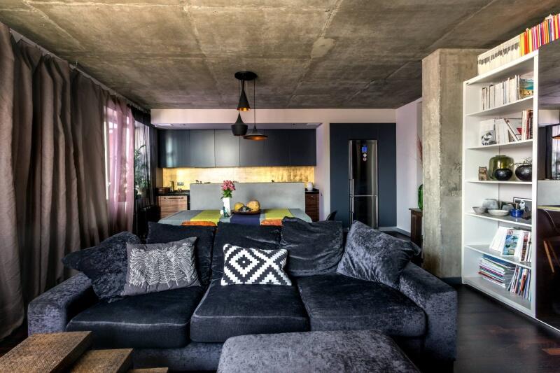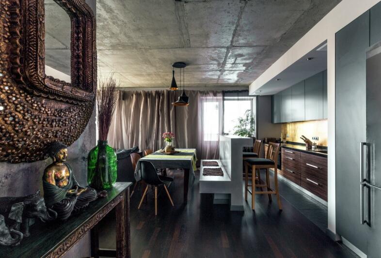 Бетонные потолки, бархатный диван, обилие декора из разных стран, культур и эпох – доминирующими мотивами в этом пространстве стала свобода самовыражения хозяев квартиры, супружеской пары творческих людей.