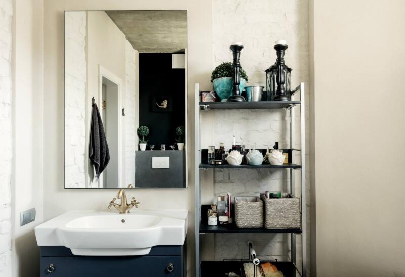 Отдельного внимания также заслуживает ванная комната. Ее минималистический монохромный интерьер украшают золоченая сантехника в винтажном стиле, черный радиатор и бумажная люстра-шар.