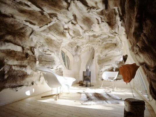 Оленьи шкуры покрывают стены дома и выполняют функцию изоляции.