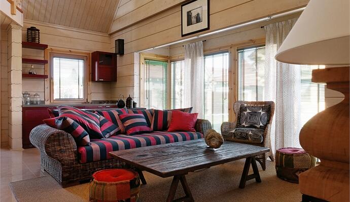 Открытые фактуры древесины и внимательная работа с текстилем — важнейшие факторы атмосферы; интерьер на 90% «сделан» сочетанием дерево-лен, и появление этих материалов в различных амплуа каждый раз по-новому раскрывает их красоту и своеобразие. Еще одна характерная деталь образа — плетеная мебель. «Курортные» диваны и кушетки создают приятное расслабленное настроение — что очень кстати в обстановке загородного дома. И конечно, атмосферу релакса и романтики подчеркивают аксессуары: всевозможные атрибуты «из жизни смотрителя маяка», ретросветильники с богемной родословной, свечи в подсвечниках-фонарях.