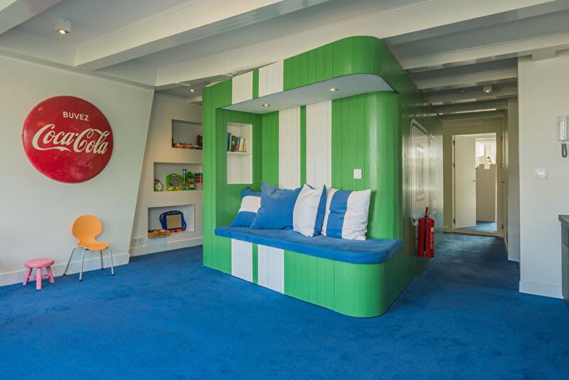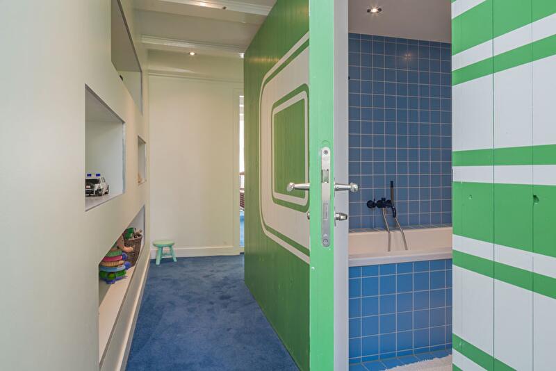 В центре каждого этажа находится встроенный объем – куб со скругленными углами. Выглядят они одинаково, но декорированы по-разному. Так, на первом этаже центральный блок отделан древесиной вяза, а внутри расположен туалет и вход в подвальное помещение. В детской куб, внутри которого находится ванная, раскрашен яркими цветами и укомплектован скамейкой; номера на стенах, как на спортивной форме – годы рождения детей.