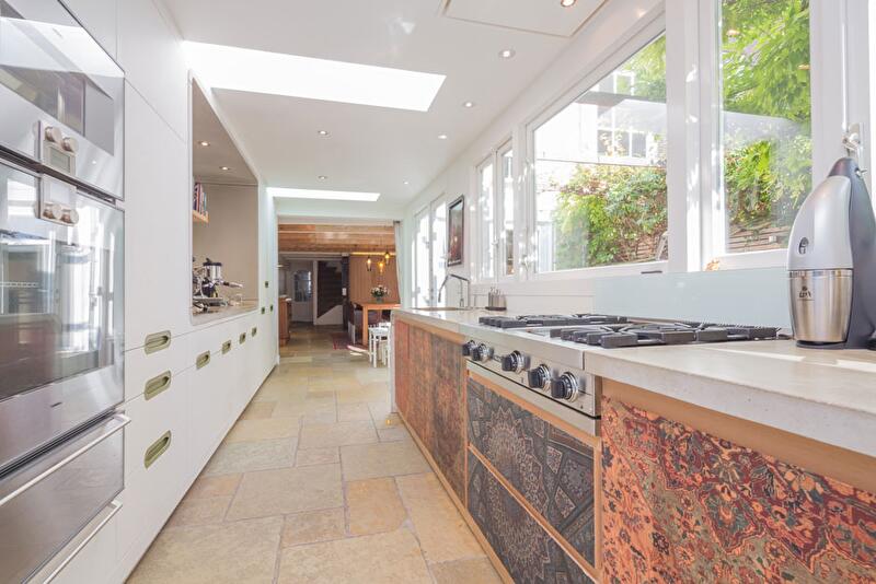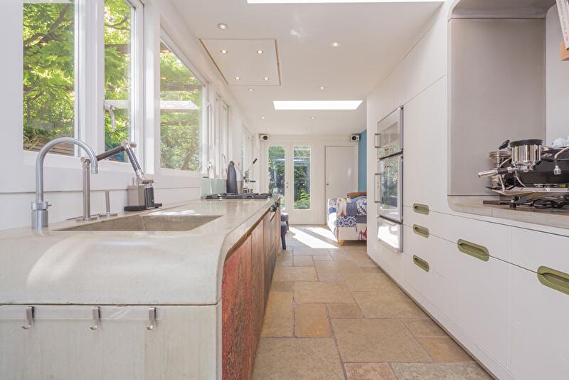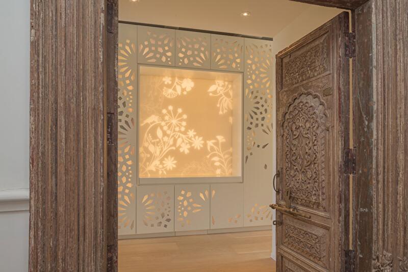 На кухне белоснежные бетонные поверхности соседствуют с деревянными фасадами, украшенными персидскими ковровыми узорами. Кстати, и многочисленные предметы мебели, выполненные на заказ, стилизованы на восточный манер.