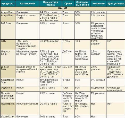 Сотрудничество банков с автопроизводителями или дилерами позволяет им предоставлять самые низкие ставки на рынке: 0% годовых в гривне, 5,9% — в долларах. Правда, условия в этом случае довольно жесткие: кредит выдают на год, с 50%-ным первым взносом. Для сравнения: банк, не сотрудничающий с дилерами и при этом выдающий кредит в долларах, декларирует ставку 16% (такая средняя ставка была и в декабре).