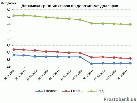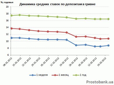По исследованию компании «Простобанк Консалтинг» с начала 2013 года средние ставки по депозитам в гривне сроком на один год снизились на 1,03 процентного пункта – до 16,44% годовых. В тоже время доходность гривневых вкладов сроком до одного месяца падала гораздо заметнее. Так, за прошедшие три месяца среднерыночные ставки по таким депозитным программам снизились на 1,74-2,98 процентного пункта – до 8,73% – 10,76% годовых.