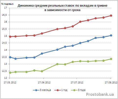 от укра инских банков. По исследованиям компании «Простобанк Консалтинг», за лето-2012 средние по рынку ставки по депозитам сроком три года выросли на 0,97 процентного пункта или на 7,8% от своего прежнего значения. В итоге, в среднем по рынку трехлетний вклад в гривне в конце августа-2012 принесет доходность в 13,4% годовых.Такой рост нельзя назвать рекордным: за тот же период вклады в гривне сроками три месяца и год в среднем «подорожали», по исследованиям компании «Простобанк Консалтинг», на 1,5 процентного пункта каждые, что составило 11,5% и 10% от их прежнего значения соответственно.