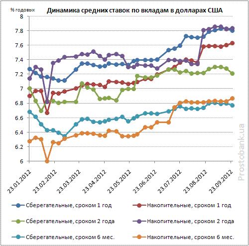 А непосредственной темой нашего обзора стали вклады в долларах от украинских банков. Доходность долларовых вкладов в сентябре демонстрировала максимальные значения для 2012 года: средние ставки по вкладам в долларах с начала года медленно росли. Так, по данным компании «Простобанк Консалтинг», средняя доходность по долларовым депозитам с начала года увеличилась на 0,1-0,7 п.п. и на 24.09.2012 г. составила 4,5-7,7% годовых в зависимости от вида и срока вклада.