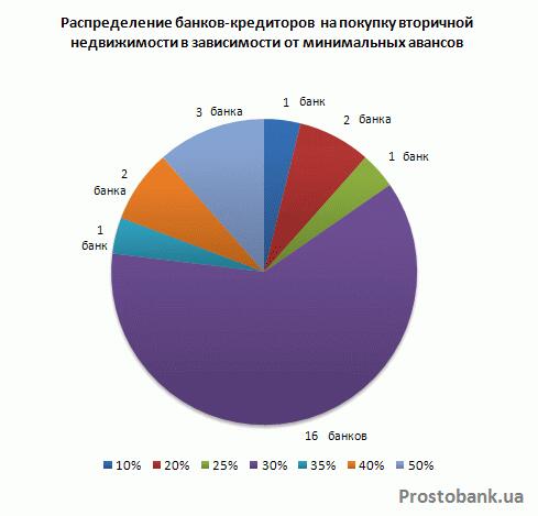 В итоге, большинство банков, кредитующих в сегменте «вторички», предлагают украинцам ипотечные программы с минимальынми авансами от 30% и ниже. Полная же картина распределения минимальных авансов по финансовым учреждениям такова: