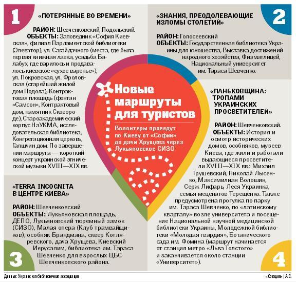 "Сейчас порядка двадцати специалистов, среди которых краеведы, библиотекари и преподаватели, разрабатывают четыре экскурсионных маршрута. Они работают по группам и детально описывают все объекты. Примечательно, что в каждой прогулке предусмотрено посещение одной из киевских библиотек — так мы хотим сделать их одним из центров для встреч творческих людей, где они могли бы обсуждать свои инициативы, воплощать их в жизнь", — рассказала нам одна из координаторов проекта Оксана Бояринова.
